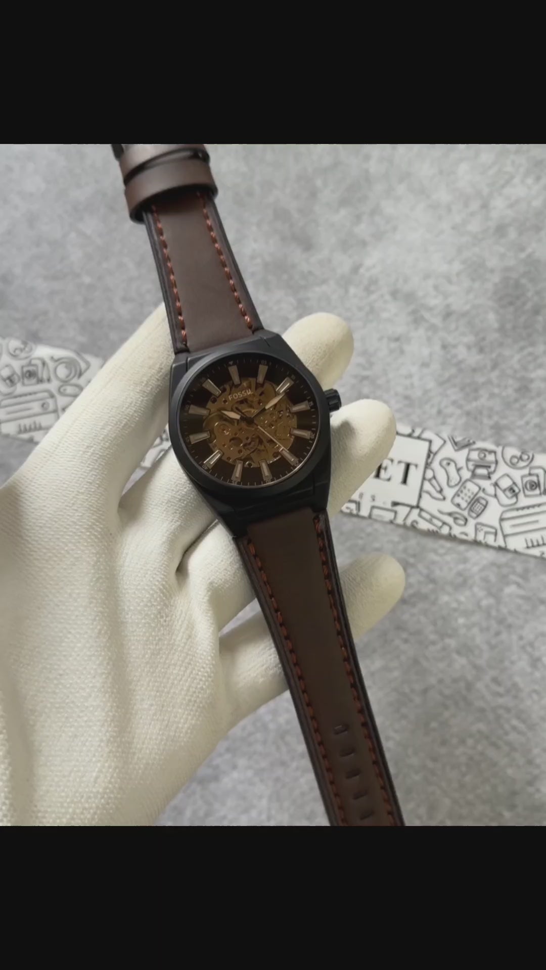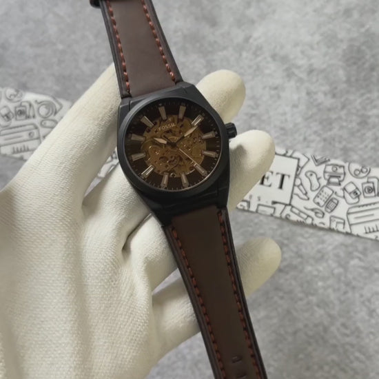 This is a Fossil branded automatic (skeleton) wristwatch, showcasing an exposed mechanical movement for a premium look.The watch features a round black case and a dial with gold-tone inner mechanics for a striking contrast.Hour markers are metallic and bold, enhancing readability and adding to the stylish appeal.The brown leather strap with prominent stitching gives the watch a classic and elegant finish.The overall design combines modern aesthetics with a touch of vintage craftsmanship, suitable for both formal and casual wear.